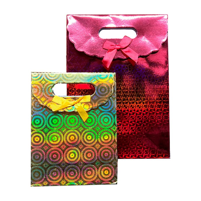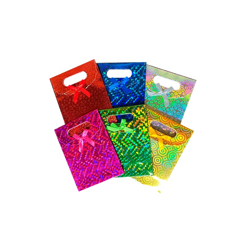 Bolsas Hologramadas con tapa con abrojo y moño Nº1, Paquete por 12 unidades, Formato: 12x16 cm., Con Fuelle, 6 colores: Dorado, Plateado, Rojo, Azul, Verde, Rosa