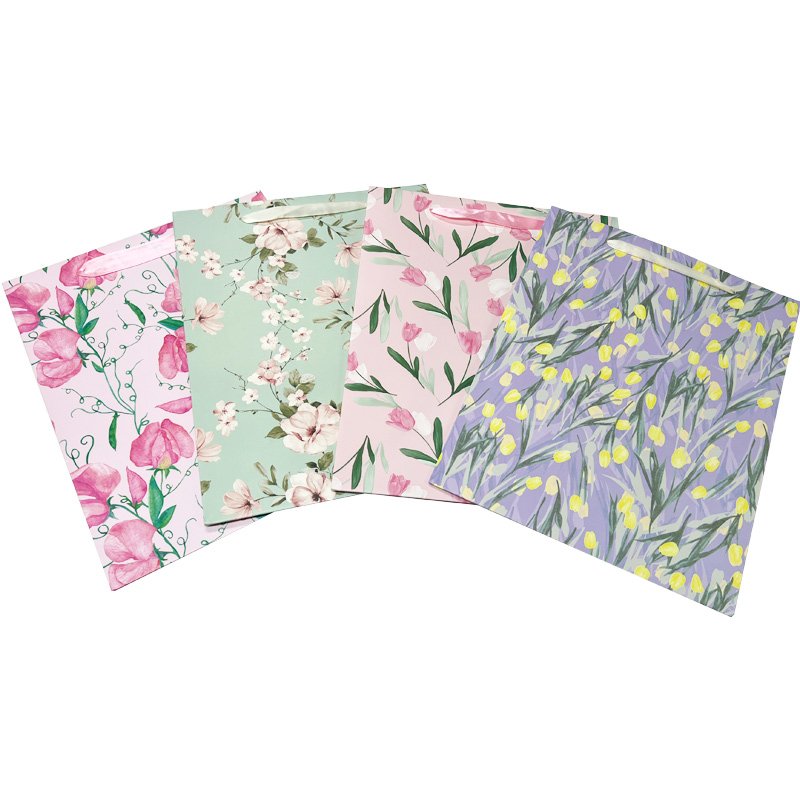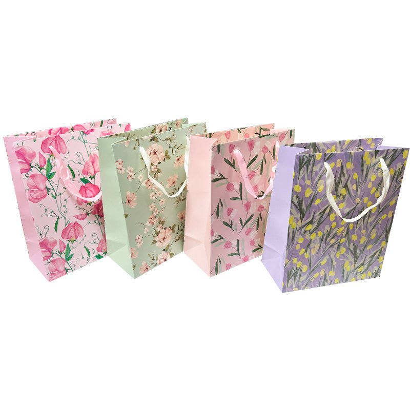Bolsas importadas con diseños Luxe de cartulina, reforzadas con manija. Formato Mediano Medidas 26x32x12cm Paquete x12 unidades 4 modelos por paquete.